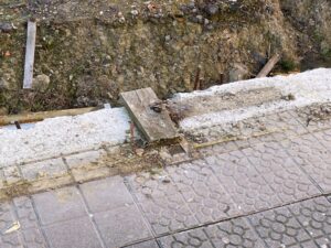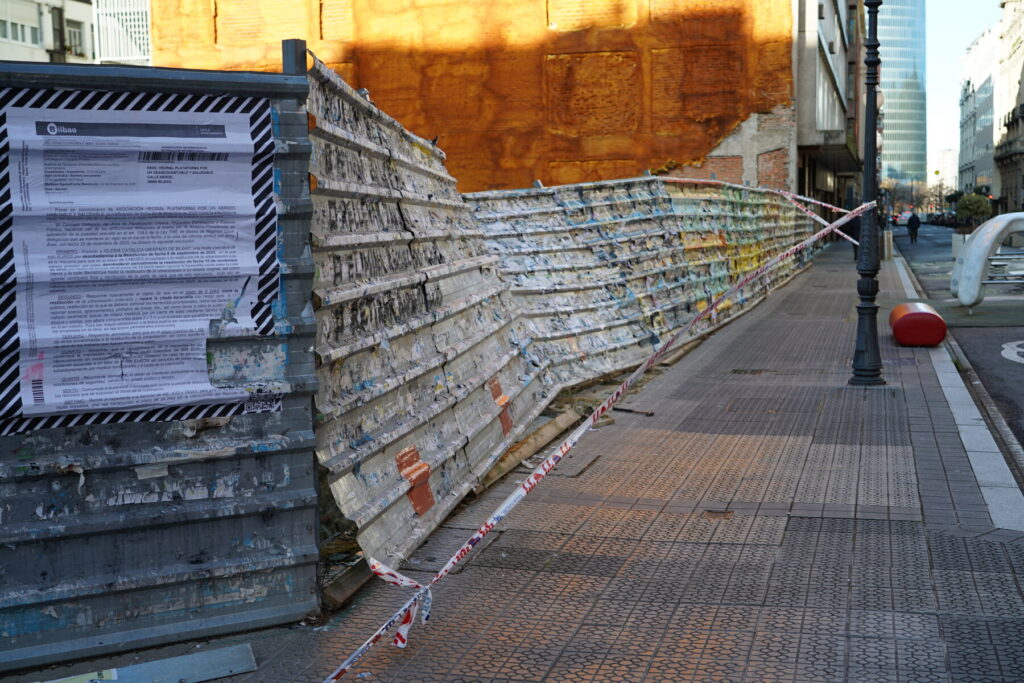 Desde Abando Habitable ya habíamos denuciado esta situación en noviembre de 2025: «Los débiles y pequeños apeos de madera son insuficientes para mantener la estabilidad de la valla, cuyos perfiles metálicos parecen empotrados pobremente el suelo. En los días de viento la valla se mueve continuamente», pero nada se hizo al respecto. El Ayuntamiento ya había requerido para entonces que la valla metálica debería ser sustituida por una en los límites de la parcela y dejar de ocupar espacio público.