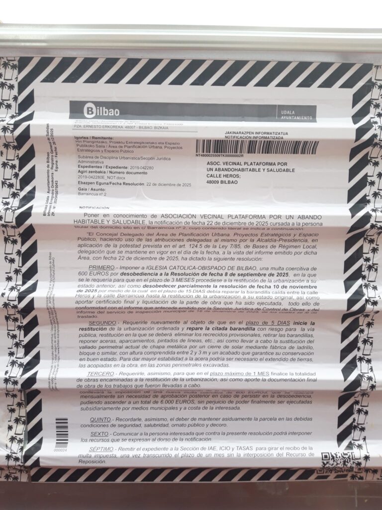 La resolución del 8 de septiembre de 2025 del Área de Planificación Urbana le daba 3 meses al Obispado de Bilbao para restituir la urbanización de la parcela a su estado original. Si el Obispado no actuaba, el Ayuntamiento debía intervenir. El Ayuntamiento finalmente impuso una multa al Obispado por desobediencia el 22 de diciembre de 2025.